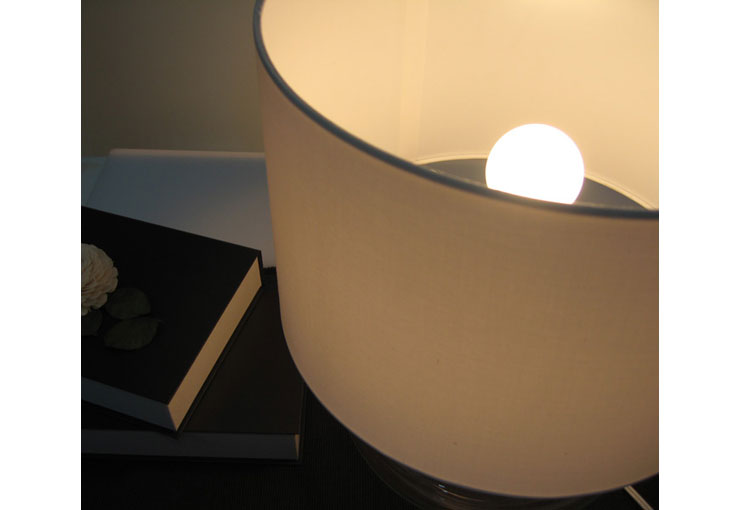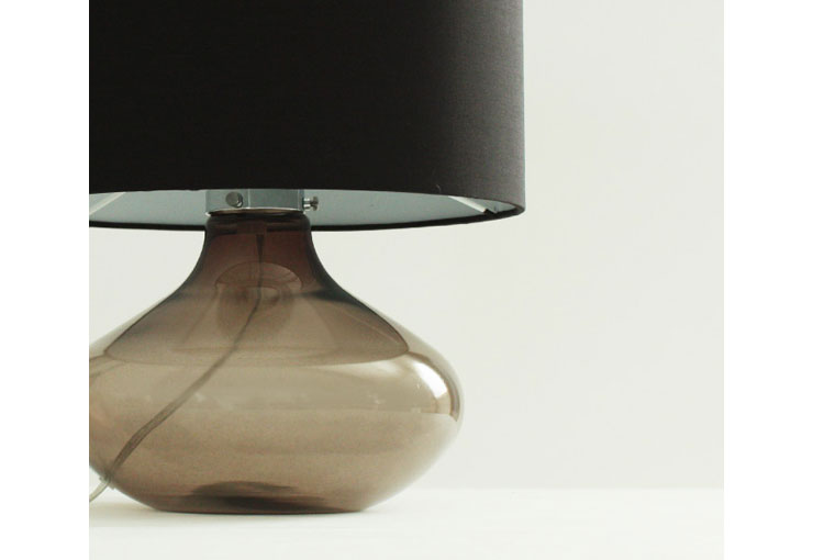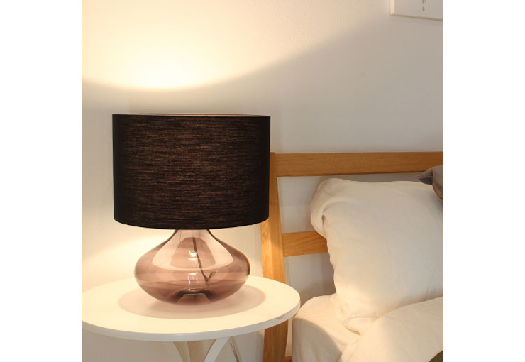 【透明感のあるガラスの艶感と曲線が、まるで水面を思わせる】美しいガラスベースに、シンプルなファブリックシェードを合わせた、ベーシックなデザインです。