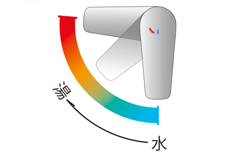 吐水口正面では水、お湯が必要なときにはレバーを更に左にまわすことで、お湯を吐水します。使用頻度の高い中央で水のみを吐水するため、無駄なエネルギー消費を防ぎます。