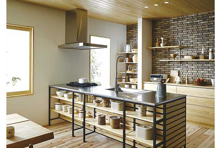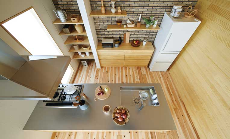 大家族の食器たちをすっきりと包む針葉樹の木目。