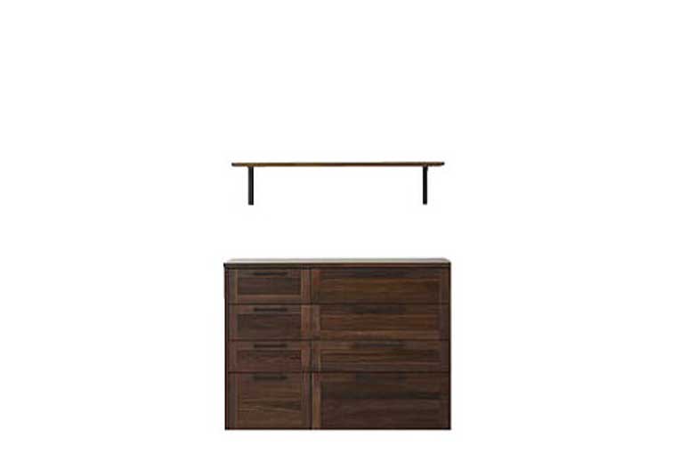 コンパクトながらも引き出しや壁面の活用で収納力を確保し、かつミニマルな上質さを生み出す無垢の木の食器棚です。