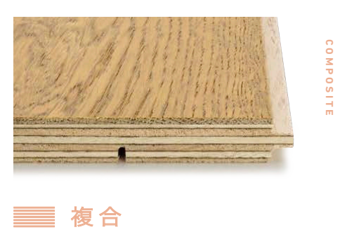 【天然木を、もっとカジュアルに。】複合フローリングとは、合板の基材に薄くスライスした木材を貼り合わせたもの。一般的な複合フローリングの表層材が0.3〜0.6mmのところ3倍以上の約1.2〜2mm厚。無垢材のような重厚感を保ちます。また、基材を資源量の多い手頃な合板にすることで、ブラックウォールナットやミャンマーチークなどの高級な材も価格を抑えることができます。
