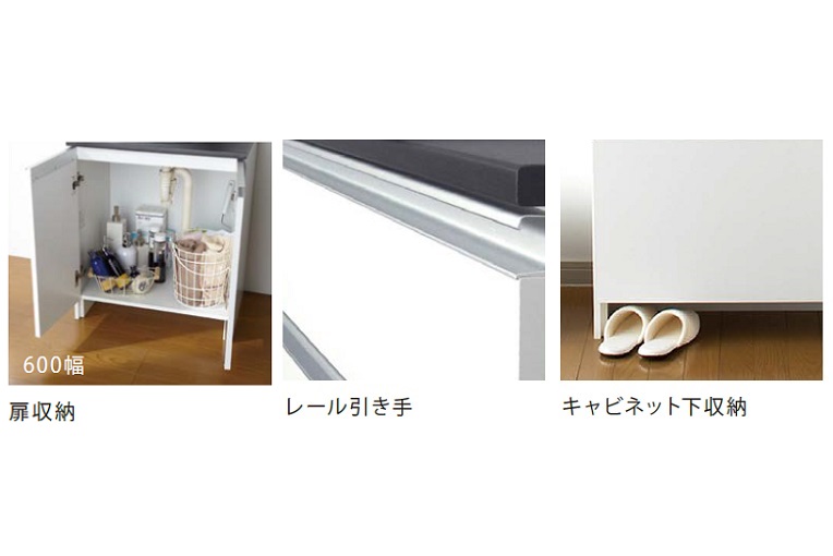キャビネットは扉仕様ですっきり収納。ハンドルは見た目をおしゃれで、扉にさっと手をかけて開け閉めしやすいレール引手を採用しています。また、キャビネット下にはスリッパや体重計を収納できるスペース付き。見た目と使いやすさ療法を兼ね備えたキャビネットとなります。