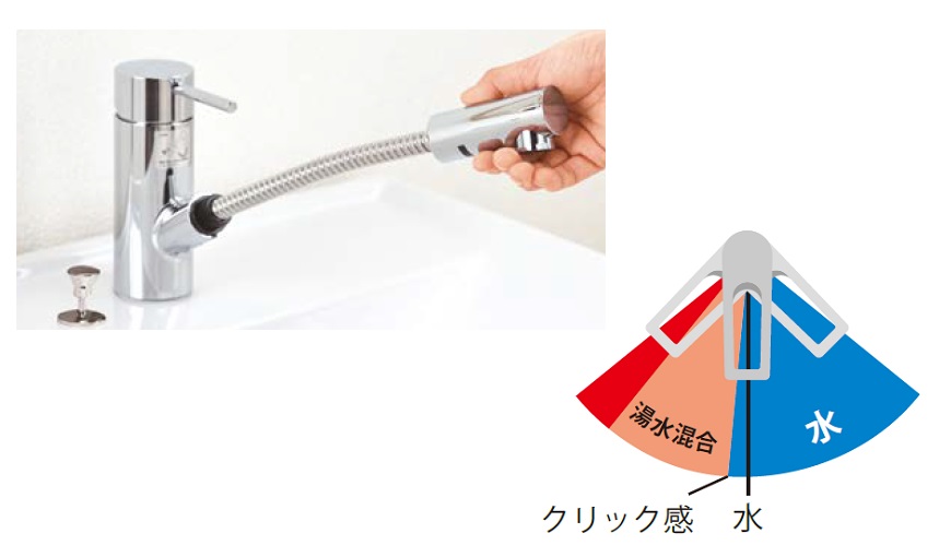 使い勝手のよい引出し水栓はボウルの隅々まで洗い流せます。水と湯の切り替えはクリック感があり、境目がわかりやすい機能を搭載。お湯をムダ使いしない節湯水栓です。