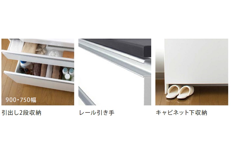 引出し収納で、片付けに困る小物類や大物もキャビネット下にキレイに整理できます。ハンドルは見た目をおしゃれで、どこからでも引出しを出せるレール引手を採用。また、キャビネット下にはスリッパや体重計を収納できるスペース付き。見た目と使いやすさ療法を兼ね備えたキャビネットとなります。