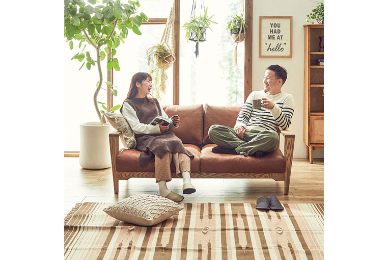 アイアン×木×ファブリックのソファは、ファブリックを変えるだけでシックにもカジュアルにも。