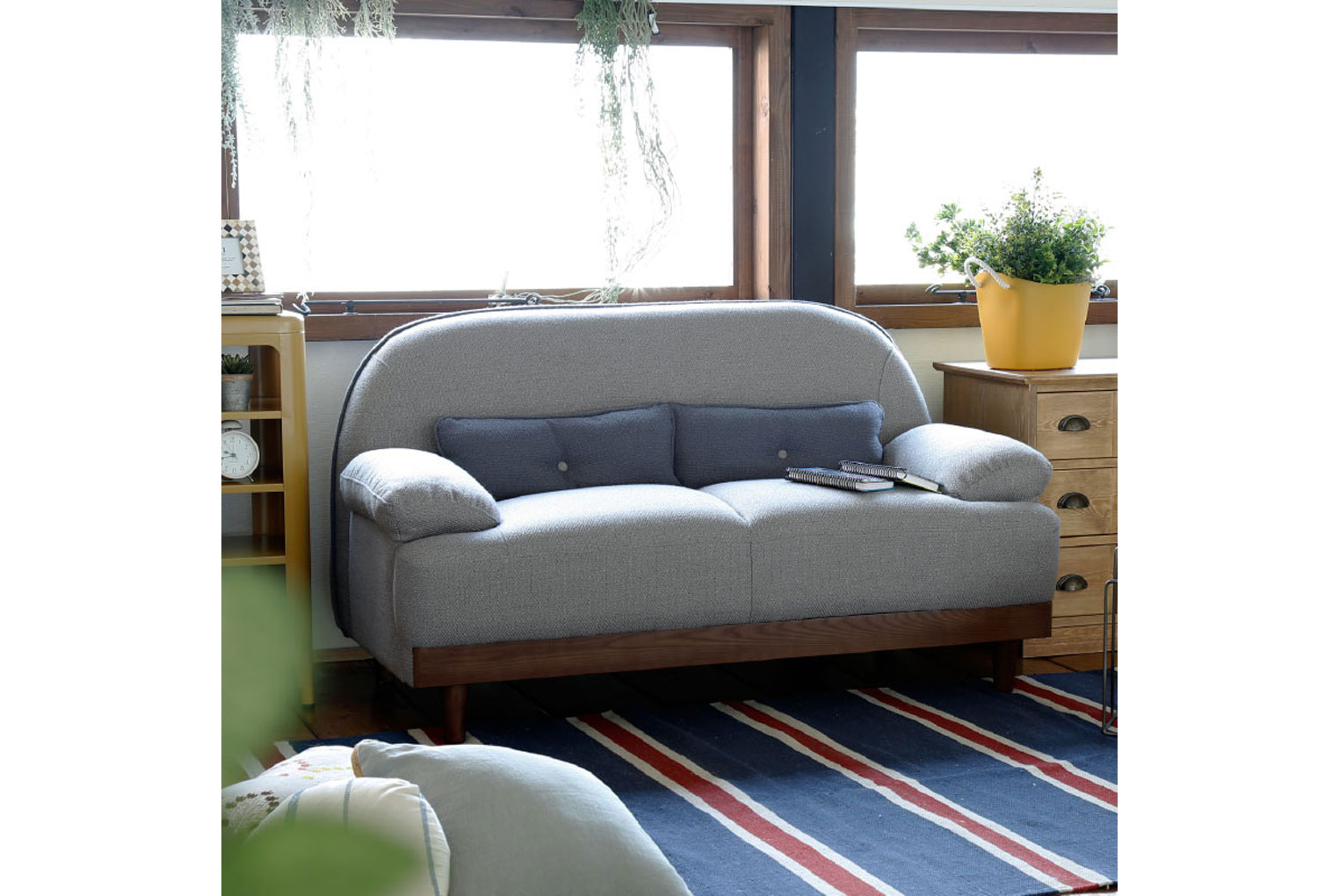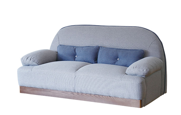 丸みのある優しいフォルムに、あえて厚めの生地に落ち着いたカラーをチョイスした可愛すぎないソファです。