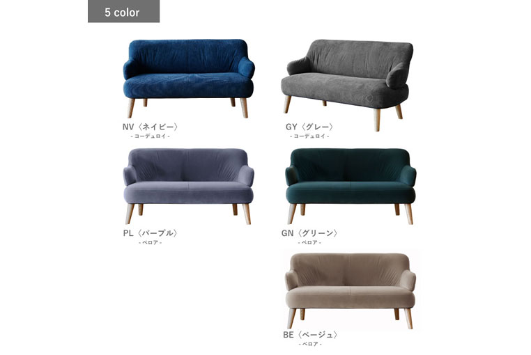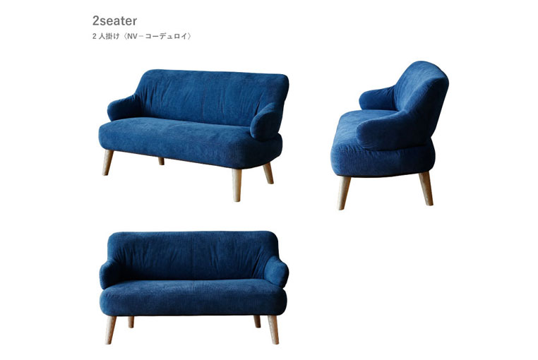丸みを帯びた可愛らしいフォルムのソファ。木の脚もスタイリッシュで、インテリア性も高いソファーです。