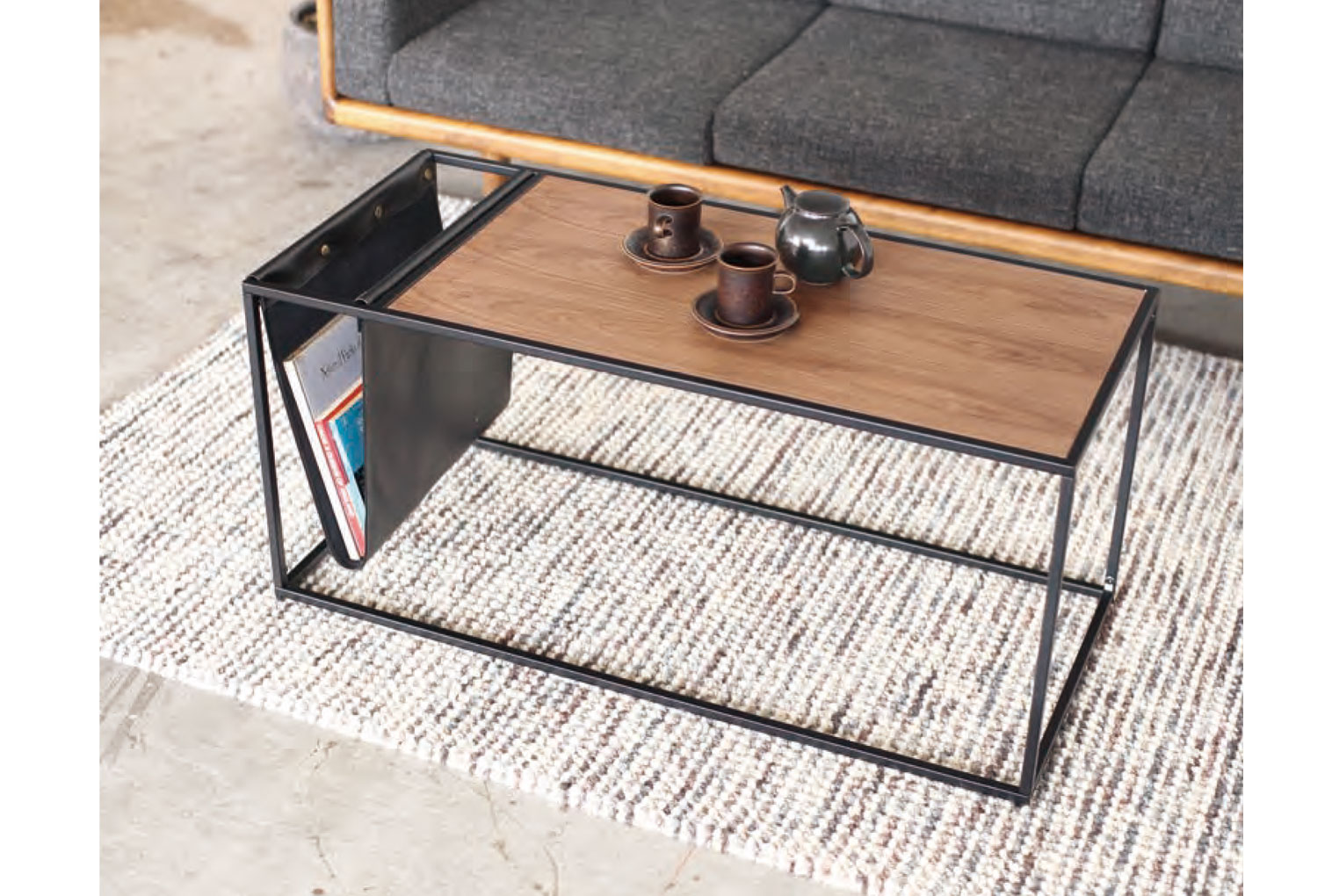 マガジンラックがサイドについて、使い勝手の良いセンターテーブル。スチール×ウォールナット×レザーで洗練された空間に。