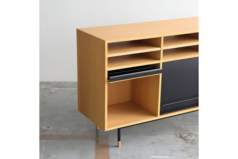 オークの木目とマットブラック仕上げのコントラストがお部屋にアクセントを加えます。