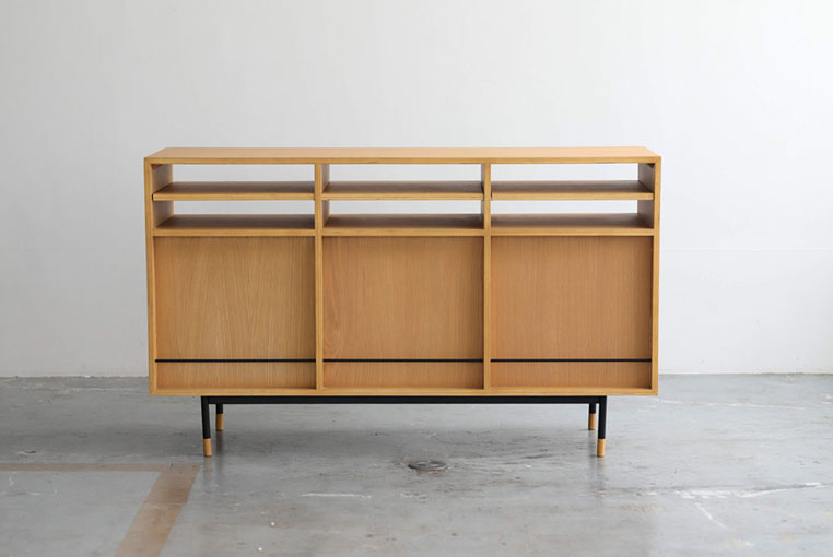 サイドボードのフラップ扉の内側はアナログレコードが収納できるサイズになっています。