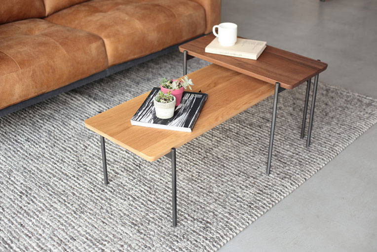 無垢材の天板にスチールの脚がすっと伸びたセンターテーブル。