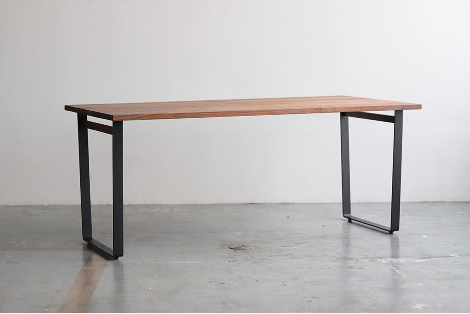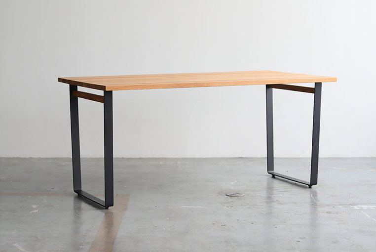 脚は金属の板を曲げてつくられたシャープでスタイリッシュなデザインです。脚上部の木製のバーがポイント。