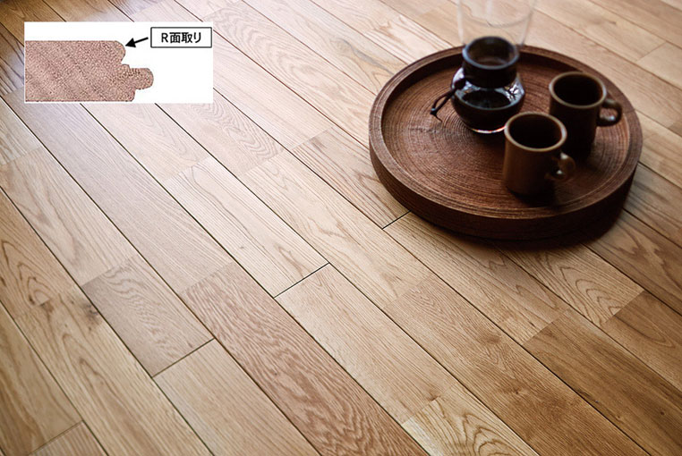 通常は角部が残る床の側面(目地部分)に丁寧なR面取りを施し、無垢材の持つ立体的なニュアンスをより感じさせる貼り上がりを実現しています。
