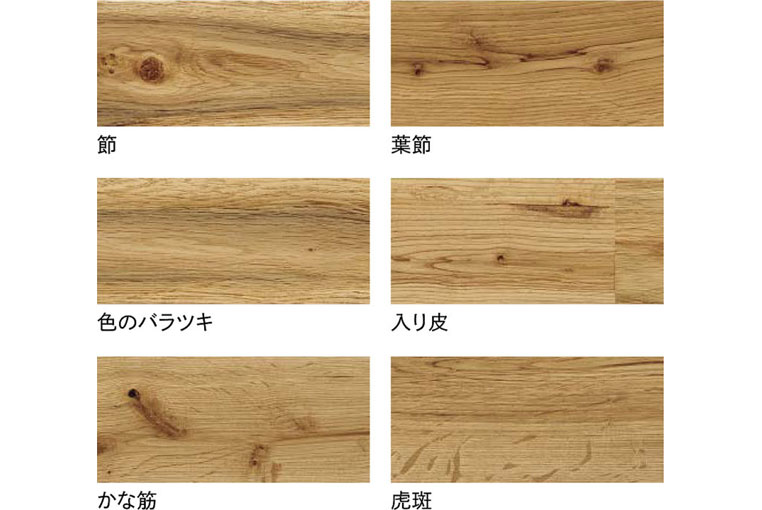 また、オーク独特の、虎の毛のような斑点模様の木目(虎斑)を楽しめるのもあり、1本の丸太で多彩な表情を見ることができます。