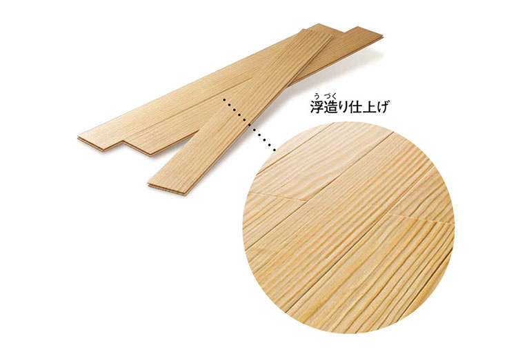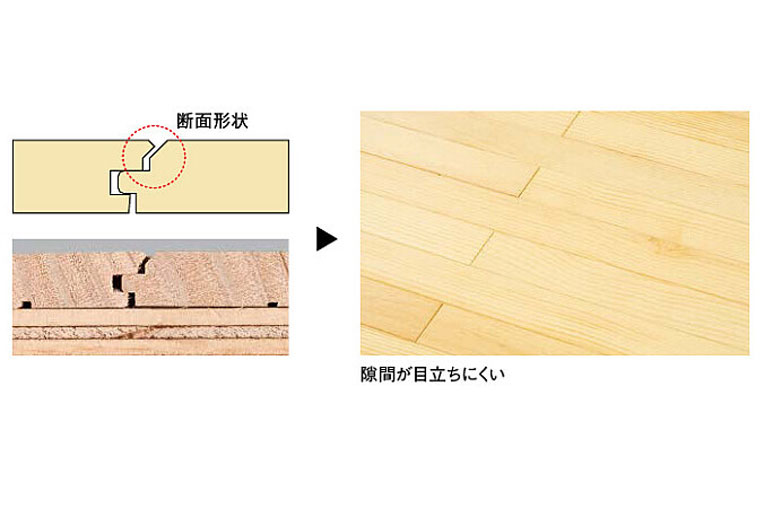 一般的に薄くするほど反りや曲がりが発生しやすい木材を、製材から「柾目」の板取を行うことで安定した品質の床材を実現しました。