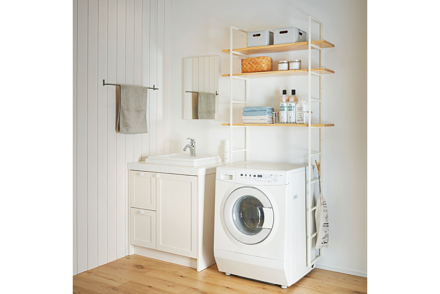 棚板とハシゴ状の金物「カベツケ」で作る収納棚。「カベツケ」を壁に固定し、そこに棚板を渡して作ります。