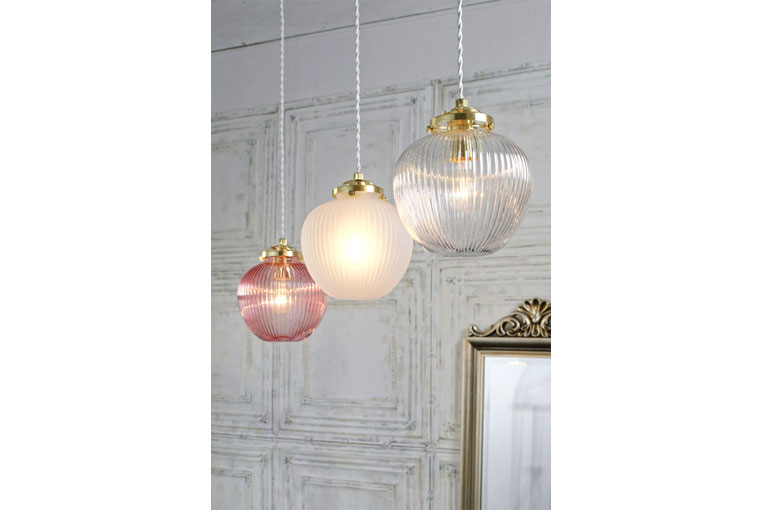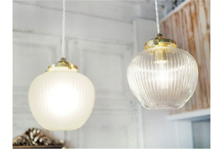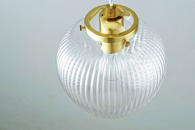 果実のようなフォルムのガラスセードに細やかなプリーツを刻んだペンダントライト。
