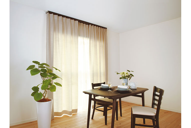 天井間際からカーテンを吊り下げることで、天井を高く見せることができます。
