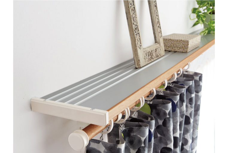 カーテンレールの上に棚をつける新発想。棚板が付いているので、カーテンレールの上をお好きなもので飾ることが出来ます。