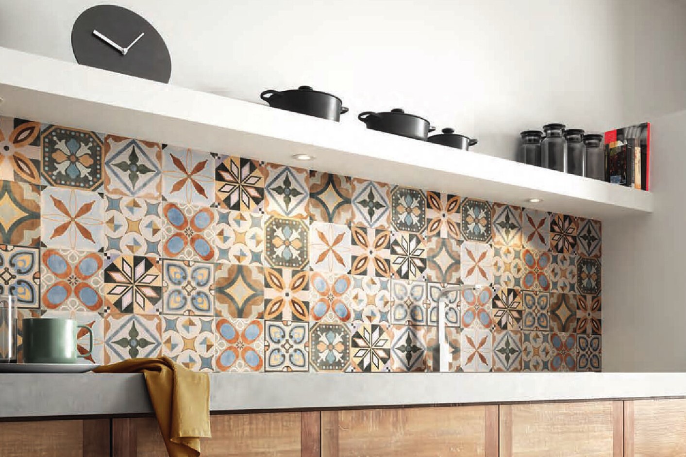 同シリーズ・無地タイプの「磁器質タイル モデルニスモ」と組み合わせて、オリジナルな空間にも。