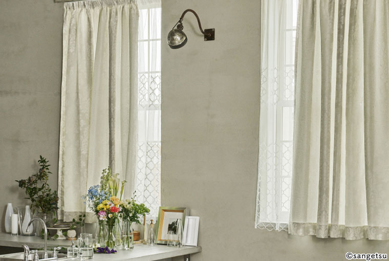 無地のドレープカーテンの上に載せると、柄が引き立つスタイルもおすすめです。