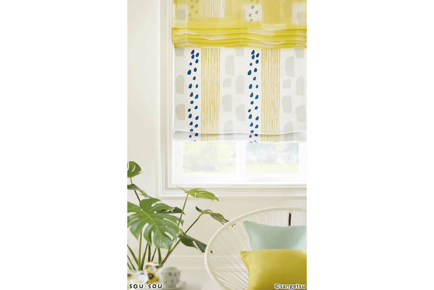同シリーズのドレープの上に重ねることで1つのデザインになるように、ベース生地の透明度が高いオパールプリントに仕上げました。