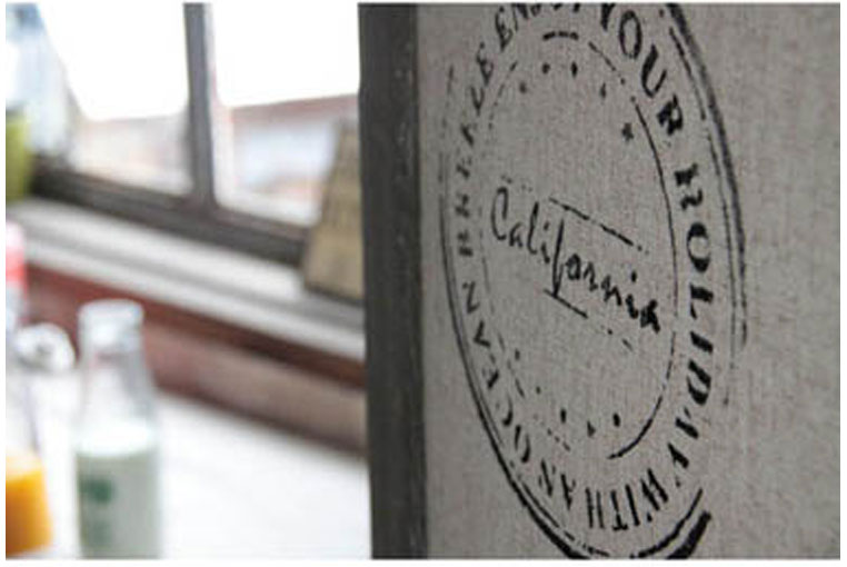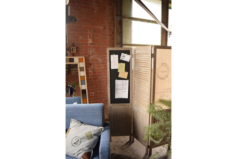 黒板、ルーバー、ファブリックの1枚ごと異なる素材を組み合わせた、スクリーン。
