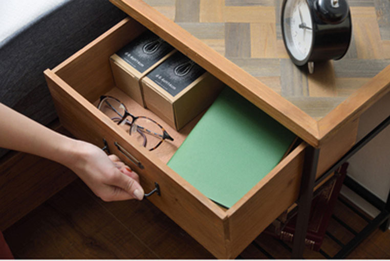 引出しの他、下段にラックも付いて、デザイン性だけでなく、利便性も高いです。