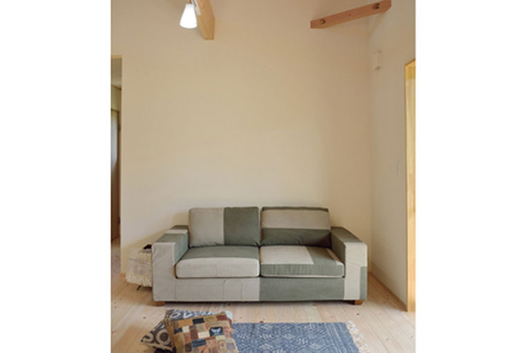 トーンの違う2色のカーキ生地を使用したパッチワークソファ。