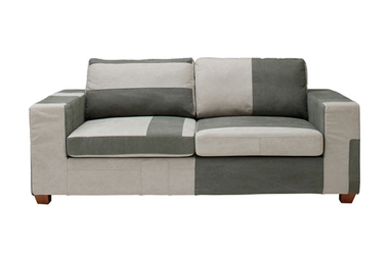 トーンの違う2色のカーキ生地を使用したパッチワークのモダンなソファです。