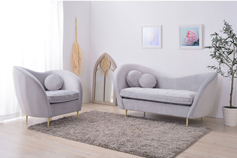 愛らしいデザインのソファ。ベロア生地を使用しているので手触りが良く、見る角度によって色のグラデーションが楽しめる表情豊かなソファです。