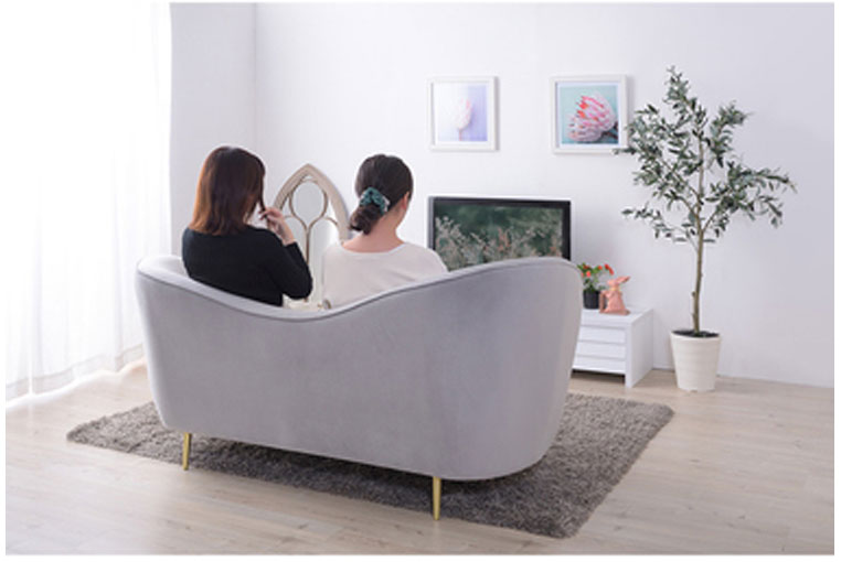 ベロア生地を使用しているので手触りが良く、見る角度によって色のグラデーションが楽しめる表情豊かなソファです。