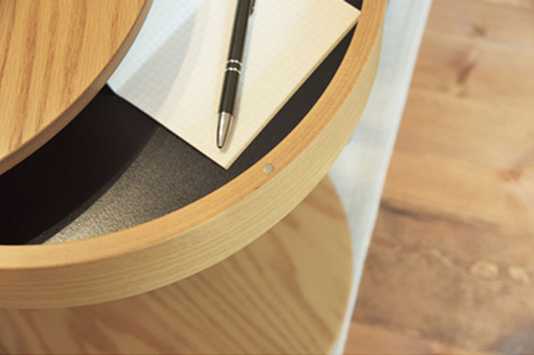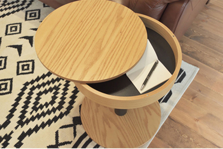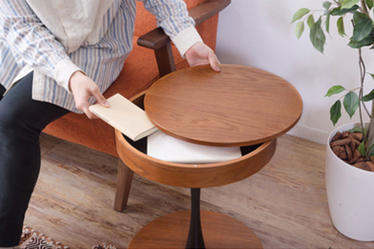 ありそうでなかった、収納スペースが付いた利便性のあるサイドテーブル。テーブルの上も綺麗に保てます。