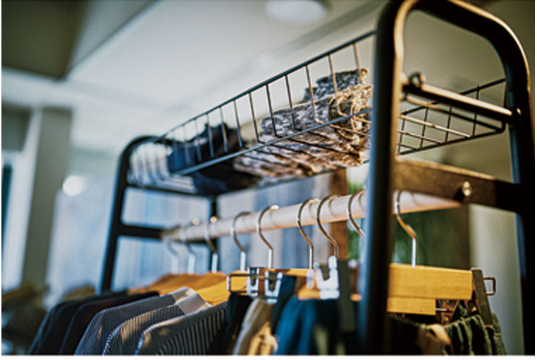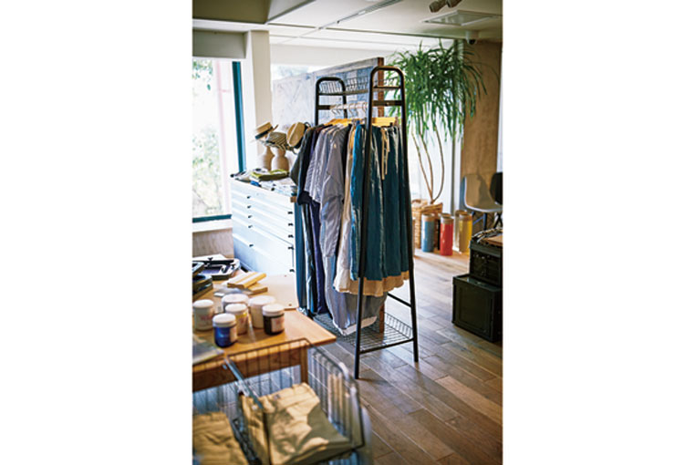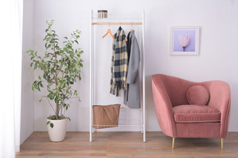 上と下にカゴが付いた、シンプルでありながら、収納力の高いハンガーラック。