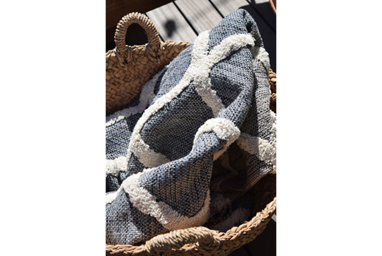 生地の模様に膨らみを持たせた、コットンのラグ。年間通して使用できる素材と色合いです。