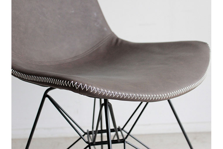 張地には味わい深いキャメル色の合成皮革を全体に覆い、ビンテージ感を存分に感じさせるデザインチェア。