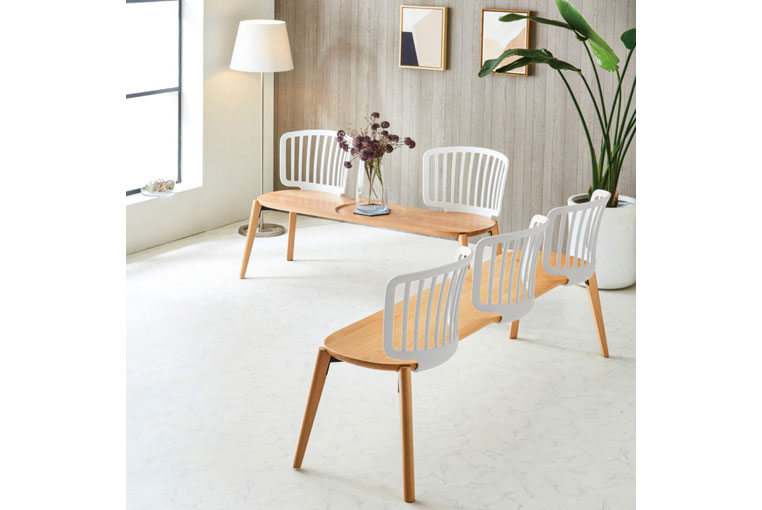 まるでフライ返しのような背もたれが目を引くデザインのベンチ。待合室やロビーなどのアクセントに。