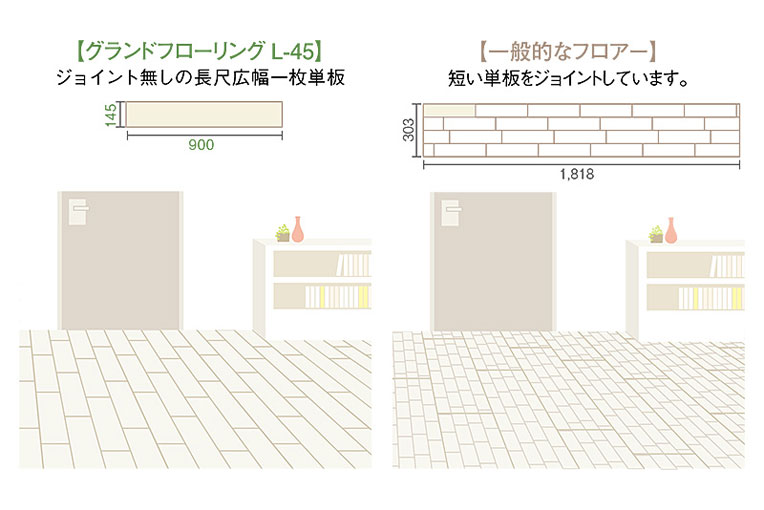 一般的な床材は短い単板をジョイントして使います。「グランドフローリングL-45」は広幅一枚単板を贅沢に使用しているので、空間を広く見せることができます。