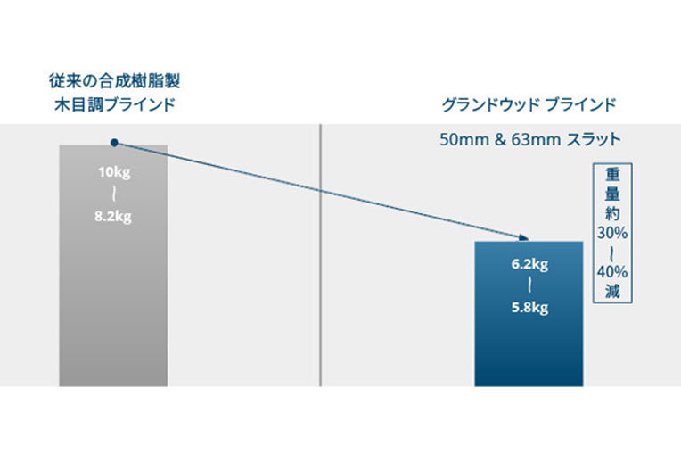 グランドウッドブラインドは、独自技術でこの問題を解消。一般的なウッド調ブラインドと比較し重量が30〜40%軽くなりました。