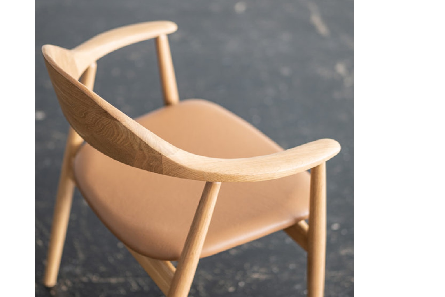 柔らかな形状の笠木が印象的な本格的なアームチェア。背中からアームの手がかりにかけて身体に沿うように3次元に削り出された曲線を、シャープな稜線で美しいフォルムに際立たせた、快適な座り心地と上質なデザインが両立したチェアです。スタンダードで長くお使いいただけます。