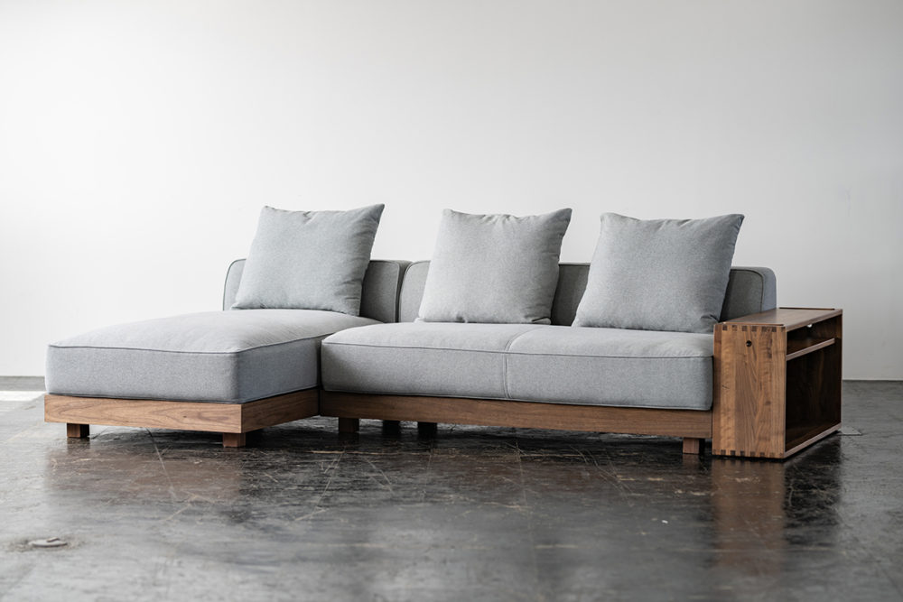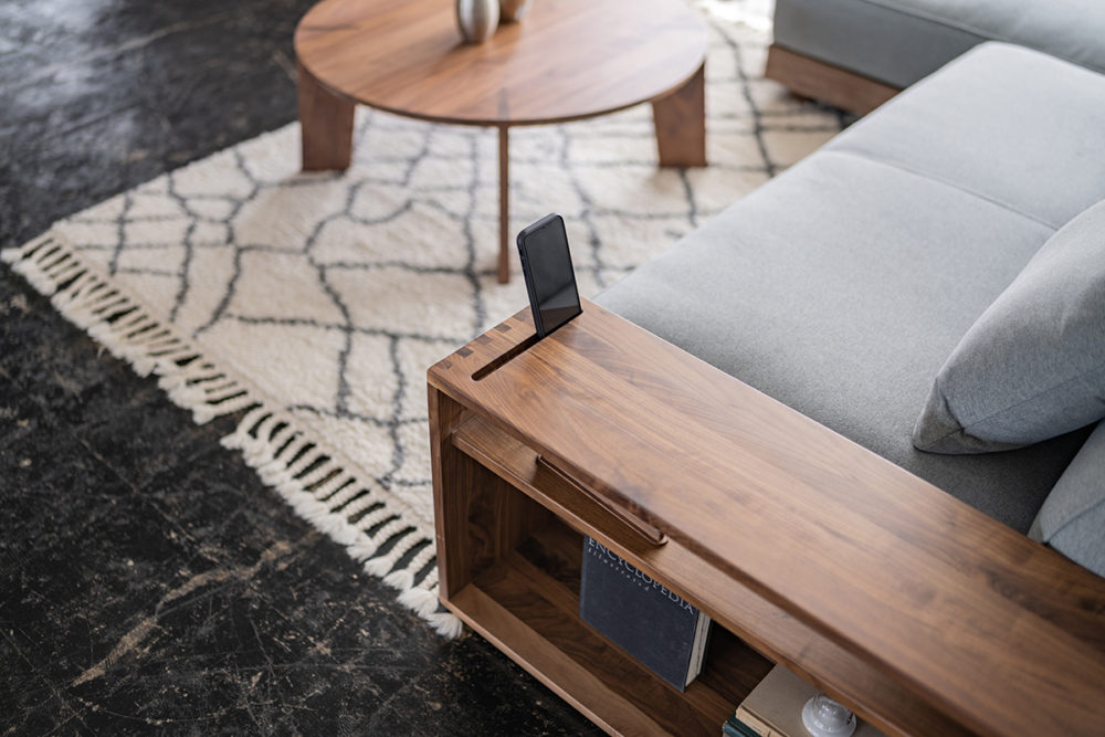 ウォールナットのモダンで落ち着いた雰囲気のリビングシリーズです。自由な位置に配置できるサイドシェルフとサイドテーブルを組み合わせて、より快適なリビングを演出できます。スマホやタブレットを立てることができます。(配線穴付)