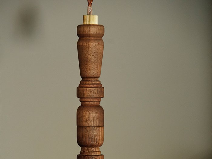 シンプルなガラスグローブにリズミカルなウッドの柱が特徴的なペンダントライト。ハロゲン電球を使用する事で小さなグローブでも効率の良い光源を確保しています。