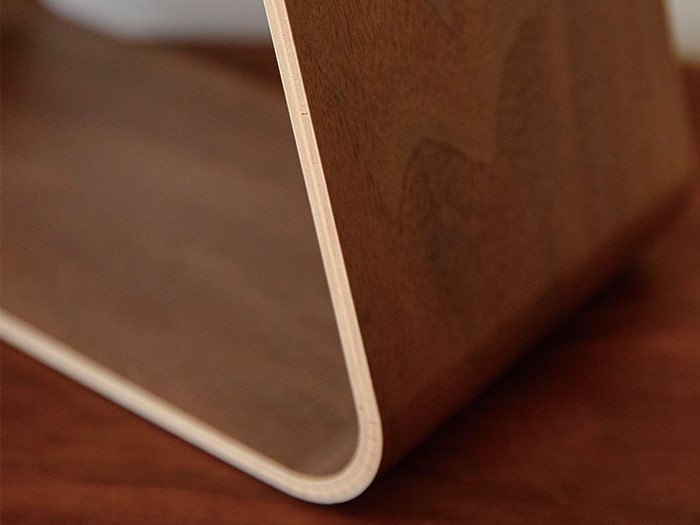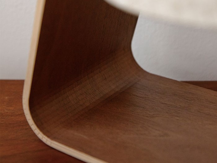 突板張りのべニアを曲げ加工で台形に加工した特徴的なスタンドライト。 温かみのある優しい光が木部に反射して独特な雰囲気を演出します。