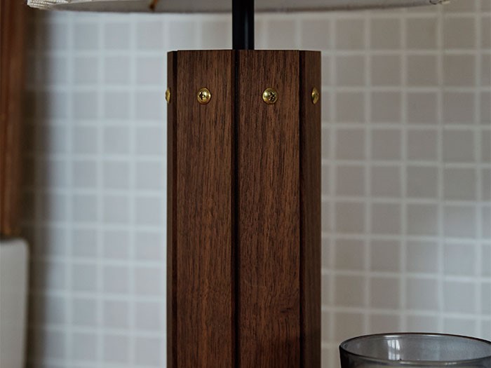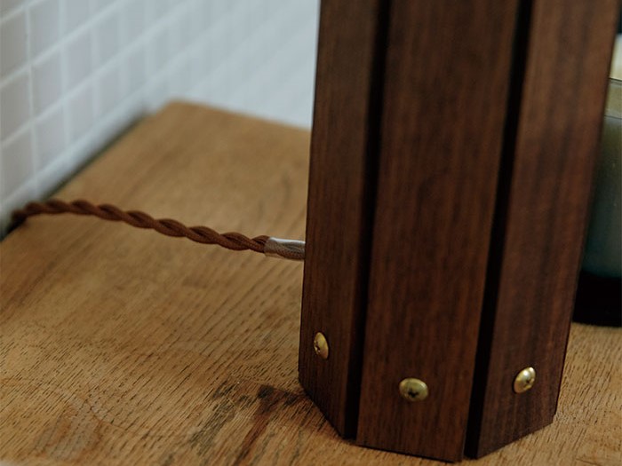真鍮ビスがアクセン トになった存在感のあるスタンドライトです。ウォールナット の無垢板と真鍮ビスは経年変化も楽しめます。