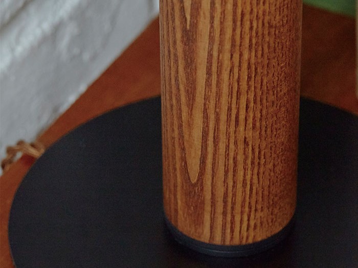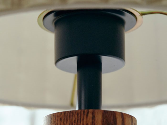 素材のベースと木の支柱、麻混の折笠シェードの組み合わせが新しい大き目なスタンドライト。無垢材を削り出した存在感のある支柱が特徴です。折笠から温かみのある優しい光が空間に広がります。