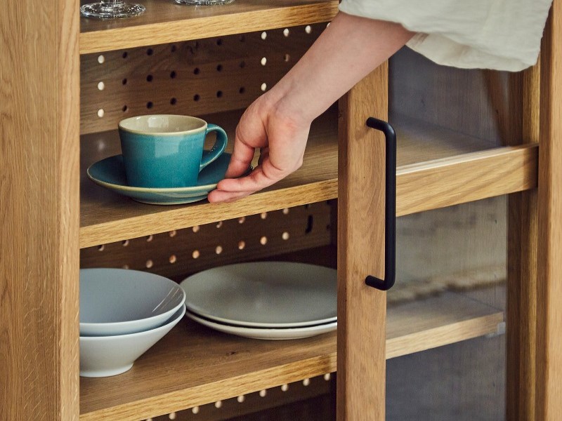 正面はすっきりとしたガラスキャビネットの見た目、背面は有孔ボードを活用してオリジナルの壁面収納を楽しめる、2面性のある商品となっております。