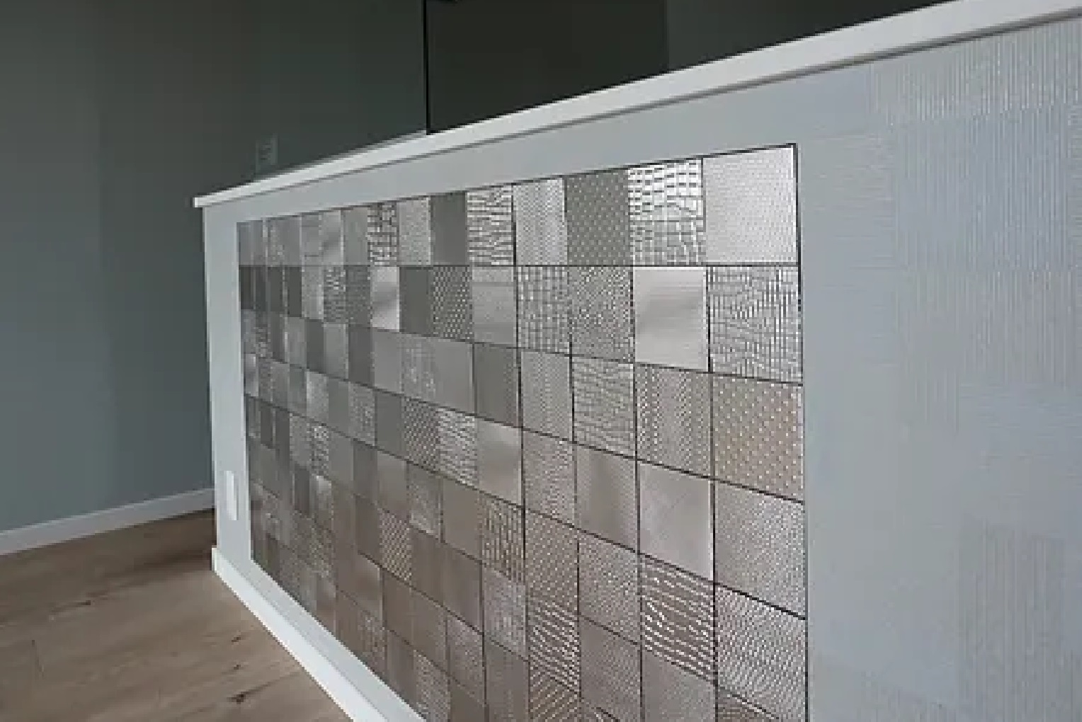 9つの異なるエキゾチックレザーパターンを組み合わせたステンレスタイル。オリジナルの金型によりプレス成型された精巧なパターンは、独特な魅力を放っています。あえて難しい金属プレス加工という表現にチャレンジし、商品化されました。本物の皮革を彷彿とさせるディティールを実現しています。