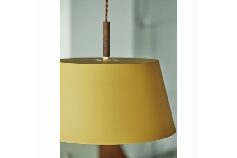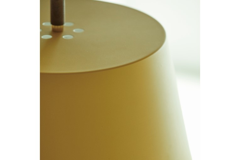 シンプルなフォルムがどんなシーンにも合わせやすい台形ペンダント。シェード上部の空気穴から光が漏れる構造で真鍮パーツとウォールナットパイプもアクセントになっています。アルミシェードの切りっぱなし仕上げでシャープさと軽やかさがプラスされています。