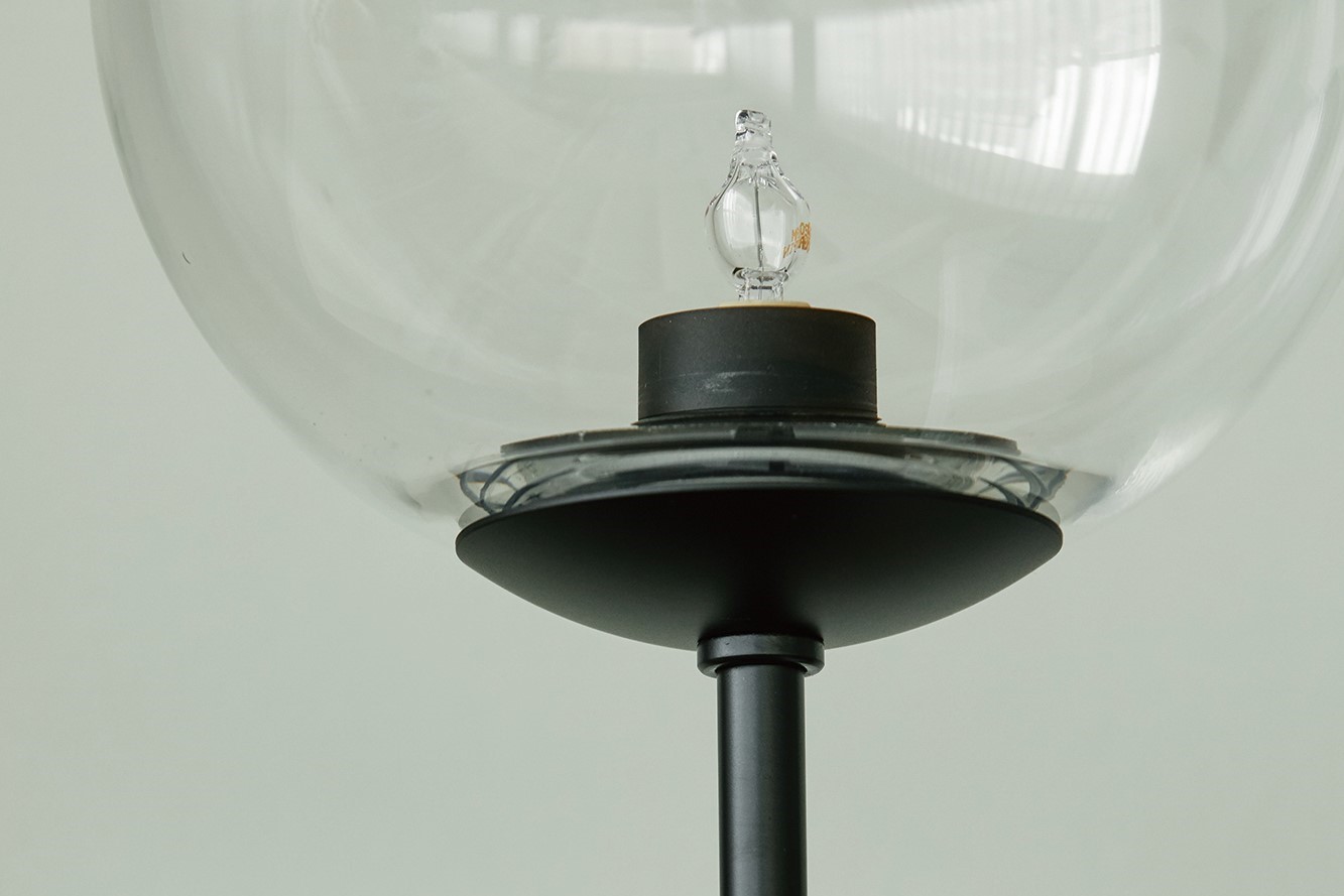 ガラスとシンプルな支柱とベースの組み合わせは使用場所を選ばない逸品です。 ランプ交換はガラスを回すことで簡単に交換可能です。