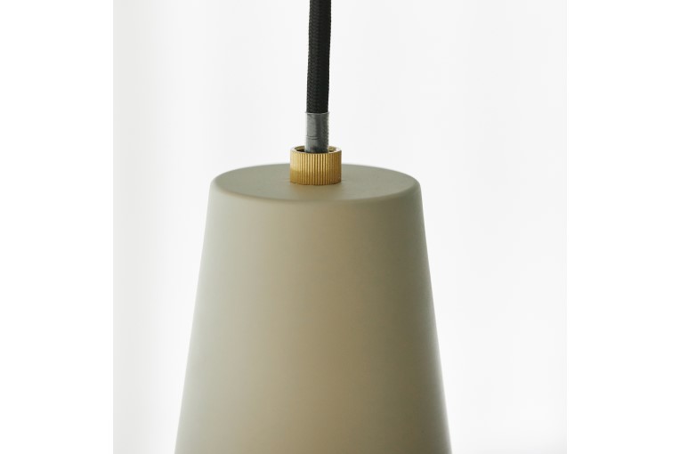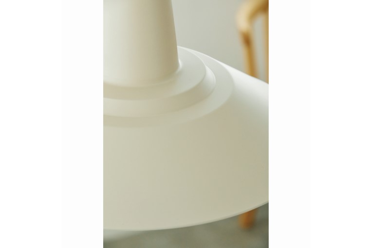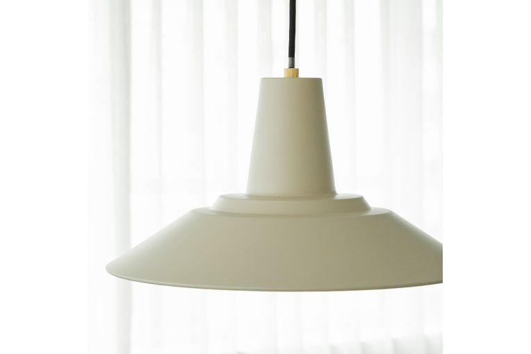 凹凸のあるフォルムと配光を広くとったシェードが特徴のペンダントライト。シンプルなカラーリングと真鍮パーツがアクセントになっています。